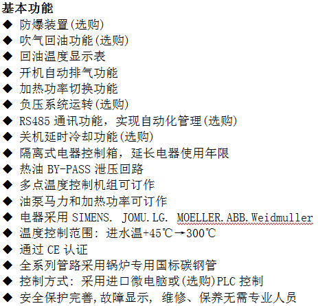辊筒模温机采用德国SIEMENS、CARLO、美国CRYDOM、英国WEST、瑞士ABB、SPECK等欧美进口品牌配件,全系列模温机可实现加热冷却PID调节,自动控温。