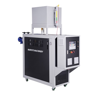 覆膜控温模温机采用电为热源,导热油为热载体,利用循环泵强制循环,将热能输送到用热设备后,继而返回重新继续加热的设备,如此周而复始,实现热量的连续传递,使被加热物体温度升高,达到加热恒温的工艺要求。当温度高时停止加热,打开冷却电磁阀利用外部冷却水经过换热器对导热油降温在对设备降温,温度低时,启动加热管加热
