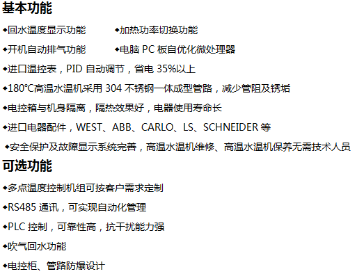辊筒水加热器是根据温度高低来区分的加热器,低于180度采用水加热器,当控制温度达到180以上,建议采用油加热器。辊筒水加热器三相380V电压50HZ及频率,特殊机型可另行设计制造。控温精度±1度,省电30%以上.瑞典进口丝双功率加热器,使用寿命长,适合不同控温场所使用.内部管路304不锈钢一体成型,加热均匀管损小,接口选用美国进口耐高温500度蓝胶,杜绝漏水现象.管路防爆装置独特的加热设计,温度自控快速达到各种产品所需温度的要求.提高生产效率和保证产品质量,180度温控设备可选水加热器。