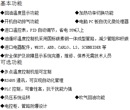 180℃油温机是以导热油作为媒介的油温机,采用电为热源,导热油为热载体,利用循环油泵强制循环,将热能输送到用热设备后,继而返回重新继续加热的设备,如此周而复始,实现热量的连续传递,使被加热物体温度升高,达到加热恒温的工艺要求。当温度高时停止加热,打开冷却电磁阀利用外部冷却水经过换热器对导热油降温在对设备降温,温度低时,启动加热管加热。