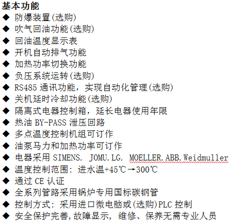 电导热油锅炉采用电为热源,导热油为热载体,利用循环油泵强制循环,将热能输送到用热设备后,继而返回重新继续加热的设备,如此周而复始,实现热量的连续传递,使被加热物体温度升高,达到加热恒温的工艺要求。当温度高时停止加热,打开冷却电磁阀利用外部冷却水经过换热器对导热油降温在对设备降温,温度低时,启动加热管加热。