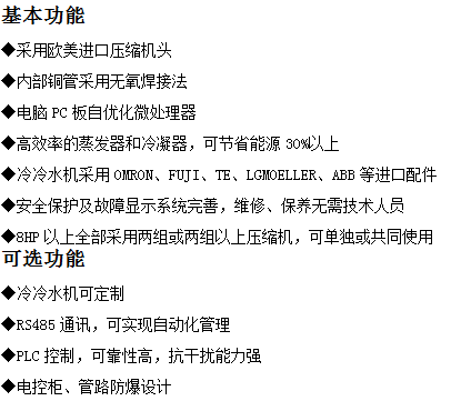 冷水机结构紧凑,运转平稳:机组的冷凝器、蒸发器均采用高效传热管,主机选用进口高效的全封闭涡旋式压缩机,具有结构紧凑、体积小、重量轻、 安装位置小等诸多优点。全封闭涡旋式压缩机运动部件少,压缩机采用柔性压缩机,能效比高,低噪音,运行成本低,可自动卸载降压没有直接磨损,可靠性高。由于是连续压缩机无脉动的,因此机组具有性能稳定、噪音低、振动小、运行平稳的特点。比往复式压缩机效率提高20%—30%;