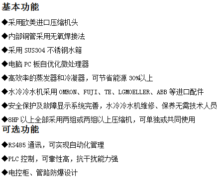 水冷冷水机采用德国SIEMENS、CARLO、美国CRYDOM、英国WEST、瑞士ABB、SPECK等欧美进口品牌配件,全系列水冷冷水机可实现加热冷却PID调节,自动控温。